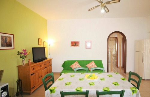 The vacation house is a 3-room property with an area of 80 square meters, located on the ground floor. It features a living/dining room with a double sofa bed (140 cm) that can accommodate additional guests. The living/dining room is equipped with a satellite TV (flat screen) and a fan for your comfort.