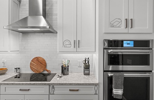 The modern kitchen features, stone countertops, Jenn-Air stainless-steel appliances (induction cooktop, built in microwave, oven, fridge and a beverage cooler), center island with breakfast bar that seats 3, a coffee/tea station and a breakfast nook. There are small appliances like an Air fryer, crockpot, blender and an electric wine opener, wine glasses etc.