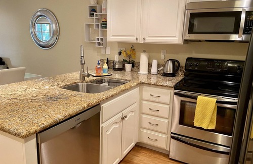 Our fully stocked kitchen includes all stainless appliances, including a NEW quiet 44 db BOSCH dishwasher, Waring blender, Kitchen-Aid Classic Stand mixer, toaster oven, Keurig Mini coffeemaker, microwave, 8-cup coffee maker, French Press, new LG side-by-side refrigerator/freezer with water and ice dispenser, and more.