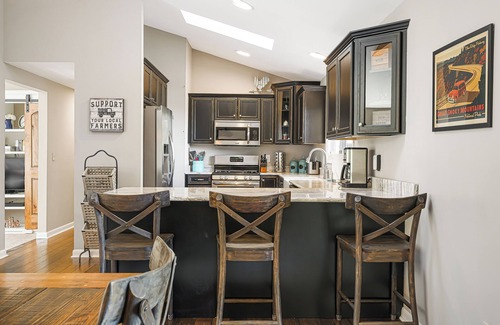 Step inside to discover a cozy, inviting living space where plush seating, warm wood finishes, and a charming wood-burning fireplace set the scene for relaxing evenings. The fully equipped modern kitchen, complete with stainless steel appliances, invites you to whip up home-cooked meals. Enjoy your creations at the barstool seating, around the dining table, or even out on the deck for a scenic dining experience with nature as your backdrop. Fun awaits in the game room, equipped with a mini basketball shootout, a vintage Pac-Man arcade, and cornhole for friendly competitions. There's also a desk space for convenient remote work.