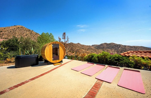 Our expansive villa comfortably hosts up to 10 guests and features top-tier wellness amenities including a newly remodeled steam room, a cold plunge, a luxurious 8-seater hot tub, and a sauna. The serene setting is perfect for yoga practice, offering stunning views of the desert and valley.
