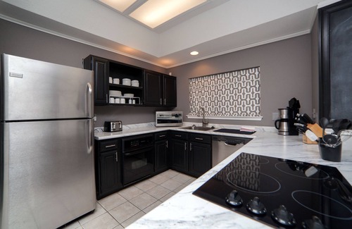 This high-ceilinged home has 3 bedrooms with 3 Queen size beds, one King size bed, 2 bathrooms, a formal dining room, a spacious kitchen with a breakfast nook, and a comfortable living room with a large sectional and a 49" Samsung Smart TV. There are Samsung Smart TVs and wifi and apps. in each bedroom. There is wireless cable programming and internet.