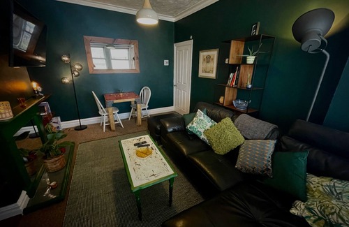 Step into a warm, inviting living room filled with eclectic decor and a stylish modern touch. Featuring dark green walls, a comfortable sectional sofa, a large flat-screen TV, and a chic modern mantelpiece, this space is perfect for unwinding after a day out. The room’s vibrant atmosphere is complemented by soft lighting and botanical accents, creating a cozy ambiance for your stay.