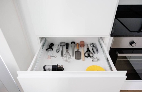 • Kitchen with induction stove, oven, dishwasher, fridge, Nespresso machine, toaster & cooking essentials