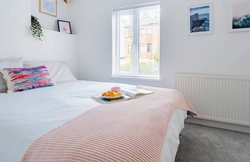 The open plan living room is light and bright with lots of homely touches, such as a large velour sofa (also a double sofa bed) with cushions and throws as well as books, plants and prints. It's the perfect spot for a cosy night in and you won't struggle to find something to watch on the Smart TV with apps. The brand new kitchen is well stocked and has everything you need: from an electric hob and oven to a toaster, kettle and cooking utensils. Out back, there is a separate utility space with a fridge and washing machine as well as a downstairs w/c. The house has a spacious yet private garden with views of the distant hills. In summer, enjoy slow breakfasts out in the sun or cook dinners on the BBQ! Upstairs, there are two bedrooms both with king-size beds. Like the rest of the house, the bedrooms have been kitted out with tasteful touches: such as as knitted throws, plants and prints. The walls are crisp and fresh and the carpets brand new. The family bathroom has a bath as well as an overhead waterfall shower. Its convenient location and calming interiors make this a gorgeous base to explore the very best of Cornwall. Dogs welcome with fee of £20/dog (max 2). It is on the condition they are not allowed on the soft furnishings or in the bedrooms.