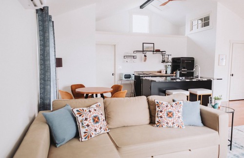 The Loft is a spacious, 645-sqf studio apartment with soaring vaulted ceilings. The apartment is beautifully appointed with retro touches. The open concept space has a living area, kitchen with bar seating for 2, dining table and chairs for 4, a sleeping area and a bathroom with tub & shower combo. With a queen bed and a large sofa that converts into a comfortable full-size bed, you can sleep 2-4 people comfortably. There is a TV with Amazon fire stick to stream your favorite shows and a Bluetooth sound bar. The Loft is located above a two-car garage on the 112-year-old Historic Hampton House 1908 estate.