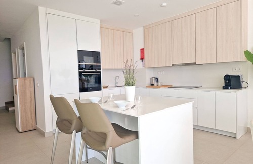 This modern spacious property is located on the ground floor and is arranged over 2 levels. The spacious open plan living area offers quality furniture throughout. The kitchen is fully equipped and benefits from an island with bar stools. There is a separate utility room fitted with a washing machine . The dining seating area will seat six people and the lounge has a comfortable sofa, two chairs and a 65¨smart TV. The two walls in the living area leading out onto the terrace and garden, benefit from pocket sliding doors, which completely slide back into the walls, combining the outside and inside into one area. Leading out from the lounge you can enjoy the large terrace and garden areas, which are furnished with a dining seating area and lounge seating area. This floor is home to the third bedroom, which benefits from a super king size bed and fitted wardrobes. This bedroom has access to the terrace and the guest shower room.