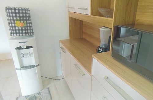 Gourmet area with an open kitchen equipped with a refrigerator, gas stove with automatic igniter, a water cooler with natural and cold mineral water, blender, pressure cooker, general cooking utensils, plates, glasses, cutlery, and other kitchen utensils;