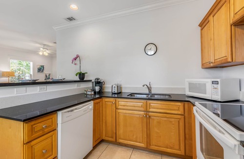 Delight in your meal creations as this modern kitchen comes with a dishwasher, stove and a full-sized refrigerator. It also includes all the necessary utensils, dishes and cookware that you will need to feed your loved ones. The bedroom features a newly-remodeled king size bed with luxurious bedding, ceiling fan and wall-mounted HD TV. The private updated bathroom has a glass and marble tile enclosed shower with 8" glass wall and door. Make room for others in the comfy living room that offers the convenience of a pull-out queen sofa bed, table seating for 4 and mounted HD TV. This all-encompassing suite has everything you need!