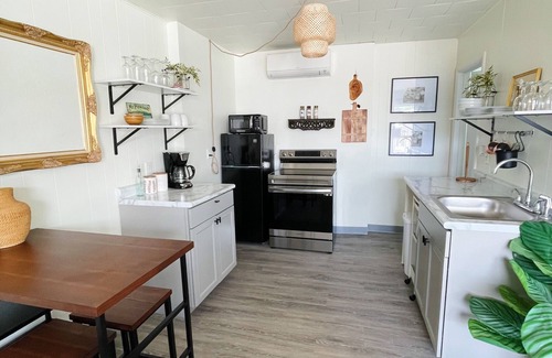 Blending relaxation and sophistication to create a little oasis! Open floor plan, 1 large bedroom with work space, central heat and air, 2 full bathrooms and flat-screen TVs for streaming your favorite Netflix shows! A nap-worthy day bed and picture window that fills the space with natural light. The kitchen features brand new appliances - oven, refrigerator, toaster, microwave, sink, and most importantly a fully stocked coffee bar.