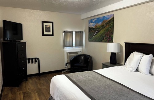 This newly remodeled modern suite features a single queen bed and a full bathroom with shower only. It has a full kitchenette complete with a microwave, refrigerator and stove/oven. Also in the room is a coffee pot with a nice selection of regular and decaf coffee. The kitchen comes equipped with all your basic cutlery. A Flat screen television with premium channels and complimentary wifi is also provided.
