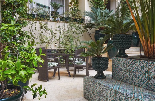 AuriSPA Suite boasts a private veranda and an exclusive terrace, accessible by elevator, furnished with sofas and a table to enjoy the breathtaking view of the Baroque roofs of Noto. The heated hydromassage pool (maximum temperature 28°C) and the wellness area, located on the ground floor, are shared with the other 5 apartments in the complex, offering an exclusive relaxation and wellness experience. The internal Arab courtyards, with fountains decorated with Sicilian majolica and lush plants, create a magical and evocative atmosphere. The property is pet-friendly, so you can bring your four-legged friends with you.