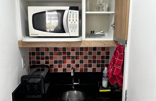 Temos uma mini cozinha que vem equipada com microondas, liquidificador, cafeiteira e sanduicheira. Tambem, TV a cabo e streaming, ar condicionado, banheiro com secador de cabelo, frigobar, e uma mesa de trabalho.