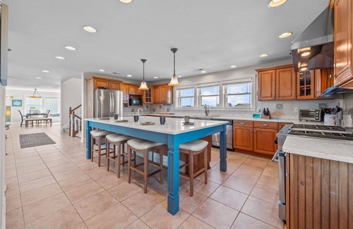 On the third level, the great room’s high ceilings, new LVP floors, and tower of windows infuse the space with a warm elegance. Plentiful and comfortable seating provides an inviting retreat to wind down the day and watch the large Smart TV. A spacious and well-appointed kitchen features stainless steel appliances, including two dishwashers, a microwave, a refrigerator, stand-alone ice maker, and large cooktop to accommodate cooking for a crowd. Eight bar stools add extra seating for full-family meals that can be enjoyed together around a 12 to 18-seat dining table. The place you really want to be though is those multi-level decks, nicely furnished to draw you into the mesmerizing views as the waves provide a backing soundtrack. Make that wow factor a reality by booking WINDOWS OVER WAVES today.