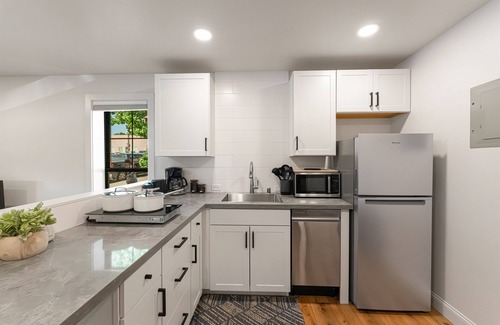 This is one of 12 boutique hotel rooms at Summit Lofts but is one of only two private suites on the ground floor with a separate entrance off of the alley. This is the only room in the hotel that allows pets (only well behaved dogs under 50 lbs and over 2 years old allowed).