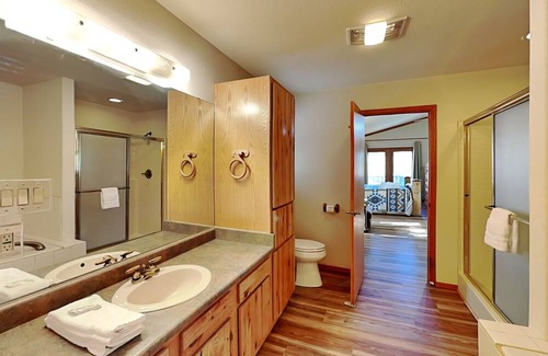 Accommodating up to ten guests, Summit View Lodge features three bedrooms and three and a half bathrooms – ensuring plenty of space for everyone. The primary bedroom, conveniently located on the first floor, features a luxurious king-size bed, offering a restful sanctuary for a peaceful night's sleep. On the second floor, you will find two more bedrooms, each with a king-size bed, providing guests with additional comfort and privacy.