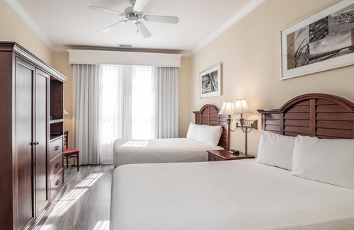 One Bedroom, One Bath S305 Suite at the Seaside Inn with scenic or lake views. Features 2 queen beds, a full kitchen with dishwasher, a dining room, a living room, a garden tub, a washer/dryer, and a screened porch. Suites are located just under 1/2 mile from the beach and are next to the main resort complex. Resort Amenities Include 4 centrally located golf courses, indoor pool, outdoor pool with lazy river and play plaza, health and fitness center, bike rentals and bike trails, tennis courts, fishing lake (fishing license required), business center, private beach access, wireless internet access, day spa, and Starbucks.