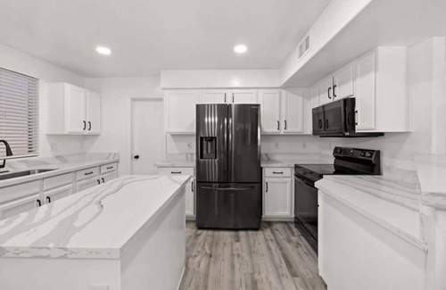 The kitchen will delight those who love to cook, blending functionality with style. White cabinets, stainless steel appliances, and bright countertops create a welcoming space for both cooking and chatting. The island and a breakfast bar serve as great spots for preparing meals or casual dining.