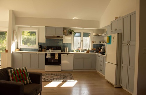 Our North Haven home is the perfect place to relax and unwind, or to take a break from the city and work from a quiet remote location. A connected dining room, kitchen, and living room with high ceilings and lots of windows gives you a great place to gather, and a large yard gives you plenty of space to lounge, play, and grill. We spend a lot of time here with our two kids and always feel refreshed after spending time in this lovely spot.