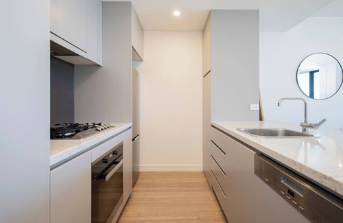 The lounge room beckons you to put your feet up with a plush pull-out sofa and matching armchair and HD TV with Netflix. Unwind watching your favourite movies or watch the sunset through floor-to-ceiling glass balcony windows. Central heating and air-conditioning ensure year-round comfort. Prepare meals in a well-equipped kitchen featuring an espresso machine, gas stove top, dishwasher, and ample storage for extended stays. Savour a coffee at the kitchen bench or enjoy a local fish and chips at a stylish white four-seater table. The sheltered balcony invites alfresco dining with a gas BBQ grill and seating for four.
