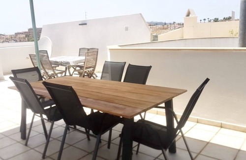 Via the staircase in the living room you come to the private roof terrace of 70m2 where you can sunbathe in deck chairs. Moreover, there is a large sun protection. For a cozy dinner there is a BBQ (plancha) and wooden furniture. To the living room there is a small terrace of 6m2. The proximity of the sea, affordable restaurants, shops, shopping center 'el ingenio' and the water park 'aqua velis' is an added value for your stay.