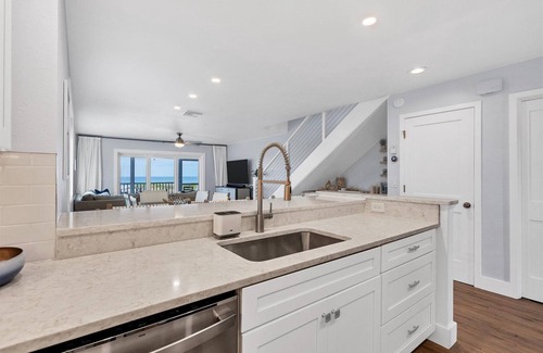 The primary suite offers a luxurious king bed, private en-suite bath, and serene Gulf-facing ambiance—your personal retreat after a day of beachside fun. The guest bedroom provides flexible accommodations with full-size bunk beds and an additional twin, making it ideal for families or groups. Each bathroom has been updated with modern finishes, enhancing both comfort and convenience.
