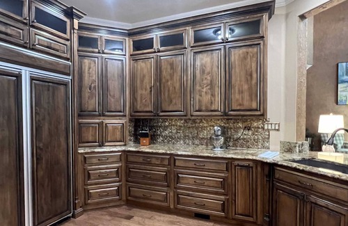 Step out of the sunroom, back into the open living room/kitchen area and you’ll find the kitchen of your dreams! A fantastic 6-burner, 2 oven Wolf stove anchors this area. An enormous granite wrap-around counter provides plenty of seating as well as a larger work-space than you’ll ever need. The kitchen is fully stocked with high-end cookware, utensils, countertop appliances, glassware and dinnerware. A full-size pantry helps organize and contain your supplies. A separate coffee bar at the rear of the kitchen offers a selection of k-cups as well as ground coffee for your morning wake-up.