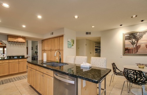 Home has 2400 sq ft of living space and is set up as a great gathering place for golf groups, families, or friends looking to get away. Living area with big screen TV and access to front patio. Front patio has incredible views of Fountain Hills and the mountain landscape which makes it a great place to unwind at the end of the day. Fully stocked kitchen for those looking to stay in and cook. Kitchen also features breakfast nook with Four Peaks mountain views. Pool table for those looking for games that can also be used as a large dining table for large group gatherings. Dual Master setup which makes it ideal for families or friends traveling together. Master 1 is large and features sitting area with big screen tv and sliding glass door overlooking pool. Bathroom has shower and jetted soaker tub. Master 2 has queen bed and newly remodeled bathroom. Other guest bedrooms include a queen bed and bunk beds in the kids room. Escape to the backyard and enjoy the views of Four Peaks mountain from the pool or hot tub. There is outdoor dining area that seats six as well as lounging area for morning coffee or late night chats. Recent upgrades throughout this home make it comfortable and functional.