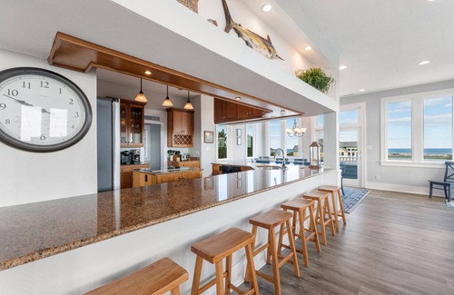 The large kitchen offers granite countertops, ocean and sound water views, two dishwashers, an oven and stove, two crockpots, a waffle maker, a pressure cooker, an air fryer and many other specialty appliances and cooking apparatus. There are also two full-size refrigerators on site – one in the kitchen and one on the ground floor in the wet bar area adjacent to the pool.