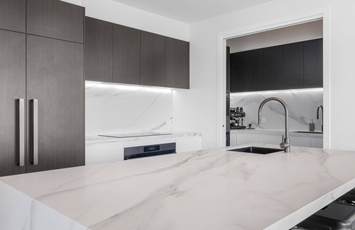 Upstairs, a generous open-plan living area awaits, complete with a kitchen, dining, and sitting area that flows out to a balcony. From here, you can sit back and enjoy the soothing sounds of the surf beach just beyond the coastal reserve. The entertainer’s kitchen is a chef’s delight, featuring a large stone island bench, an induction cooktop, and a butler's pantry equipped with a wine fridge, perfect for preparing meals or hosting guests.