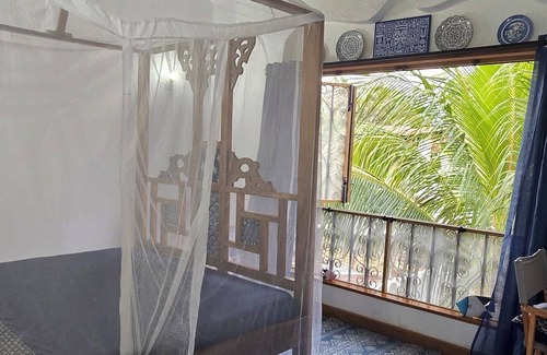 This Swahili styled house is accessed through a private courtyard in bustling Bagamoyo old town. There's a well equipped kitchen and downstairs toilet on the ground floor and a double bedroom on the first floor with a tiny bathroom. The open roof-top lounge on the second floor is a wonderful place to relax and and it offers a spectacular view of the sun-set most evenings. The cottage is conveniently situated, only a 5 minutes walk away from the beach, popular cafes and art shops.