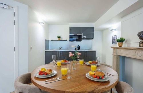 This charming one-bedroom apartment with a garden view offers a delightful way to experience Brussels in complete comfort. Elegant European-style ceiling details bring a refined sense of chic character, while the cosy bed, welcoming seating area, and private terrace overlooking the garden create the perfect setting for a morning coffee or a relaxing snack after a day of discovery.