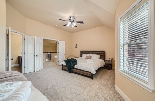 Sycamore Sanctuary is a 3000+ square foot 2-story home nestled in a beautiful serene neighborhood in Georgetown, TX. This vacation home is a beautiful 4 bedroom, 2.5 bathroom sanctuary designed for relaxation, family time, and fun. Up to 10 guests can be accommodated in the bedrooms. 3 of the rooms are upstairs including 2 guest rooms rooms with queen sized beds. In the hall between the two rooms is a bathroom with tub and shower. The Primary bedroom has a king sized Purple mattress bed and a 2nd queen bed with a Sealy Posturpedic mattress for additional sleepers or for young kids you want to keep nearby. The primary suite also has a large double vanity bathroom with an oversized tub that can easily fit two and a separate shower.