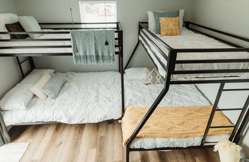 Upon entry, you will be met with a light and bright, freshly renovated interior. Our living room offers a comfortable space for you to cool off and relax after a long day at the lake. Passing through, be sure to stop at our "Frog House" feature wall and snap a few photos for your social media with our greenery and LED lighted wall. From there, you can rock paper scissors with your friends or family members for either the King bedroom or Queen bedroom with a shared bathroom located between the two. After you figure out where you are going to crash for the night, you will be met with our eat-in dining room and open kitchen concept with all the kitchen necessities you could think of. Off to the right you will notice a doorway with our stackable washer and dryer unit so you are able to travel home with clean clothes before you leave and it also has a half bathroom there as well. Continuing on from there (the kids probably already found it) you will find our double bunk room! Featuring TWO twin over full bunks, a fireplace and a sliding glass door with access to our backyard oasis. Hang out on the patio at night by the propane fire pit or play a game of corn hole in corn hole alley located just off the side of the house. You can sit back and enjoy all the live music on the weekends that you can hear playing from the various local venues.
