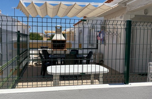 Balcony facing the avenue and back terrace with barbecue with a large table and benches.