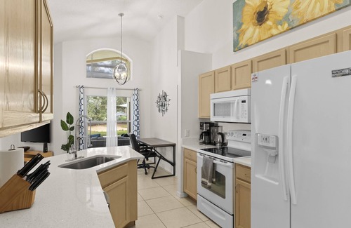 The home benefits from a great open floor plan with high ceilings and a combination living/dining room perfect for the relaxed Florida lifestyle. The open-plan kitchen has a closet pantry, located at the center of the home. The kitchen is fully stocked with the following necessities: Microwave, Fridge, dishwasher, coffee maker, and toaster, In complement to the kitchen, there is a family dining table that accommodates 6 persons along with a comfortable sofa in the living room where you can relax at the comfort of your Smart Screen TV.