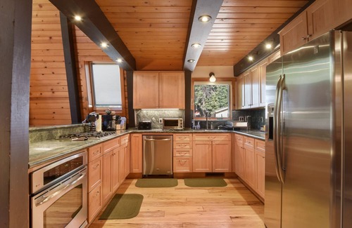 This three bedroom/two bath with a loft Lake Tahoe luxury vacation rental home has been so extensively remodeled it is like new on both the inside and outside. The luxury vacation rental is located in Agate Bay (between Tahoe Vista and Carnelian Bay on the north shore of Lake Tahoe) and features new wide plank wood flooring, custom hickory kitchen cabinets and stainless steel appliances, corner rock fireplace, two decks with nice patio furniture, 6 person hot tub, and a pool table located in the loft. The sky lights and wood work give the luxury vacation home a bright feel.