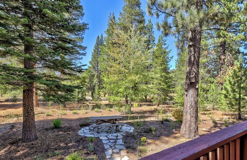 Return home and relax with a cozy fireplace, flat screen Smart TV, and high-speed wifi. Enjoy the serene Tahoe pines from the peaceful backyard, surrounded by conserved natural land. The upstairs deck offers additional space for relaxation.