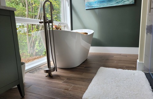 Looking to relax? Drift off to sleep in a plush queen-sized bed and wake to the soft call of chickadees, indigo buntings, hummingbirds, and song sparrows. Soak in a deep, relaxing tub while gazing out floor-to-ceiling windows, where you might spot a deer wandering through the pines. Step onto your private deck and savor your morning coffee and a homemade pastry as you take in the peaceful sights and sounds of the forest around you.