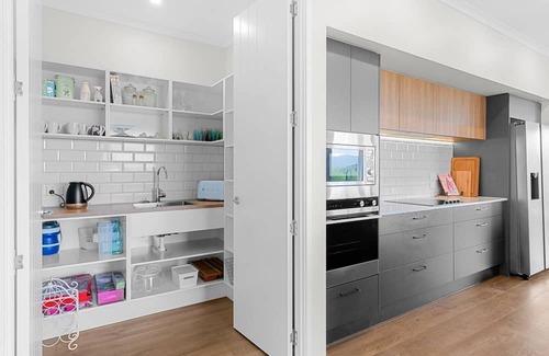 This brand new large, stylish holiday home sits on a 3.3 acre lifestyle block with mature olive trees and a feijoa plantation close to Mangawhai Village and the Heads. With all day sun and beautiful views over rolling countryside out to the Brynderwyns, it is an idyllic setting to get away from it all while still being close to the action. With lots of space and great entertaining options both inside and out, it is great for a couple of families to holiday together. The four bedroom, three bathroom house sleeps eight in comfort and bedroom four has its own living area and basic kitchenette, great for grandparents.
