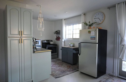 This is a very unique cottage for a couple looking for lots of space. It is two stories with very open concept on both floors. The upstairs is a very expansive space that is complete open other than the full bath. The downstairs features a living/dinning area , as well as a sufficient kitchen area. There is also a large 1/2 bath on the ground floor. The upstairs is a very large space for couple to spread out. There is a King bed and two couches. It also features desk and office chair as well plenty storage for what attire you packed. There is a small remolded full bath upstairs as well.