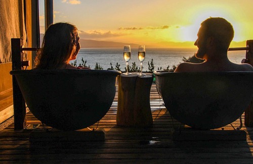 Tent Korimako engulfs the ocean and sunset views. Surrounded by native bush this Tent enjoys full afternoon sun and blissful birdsong. Take an outdoor bath and soak up the views and relax your mind. Snuggle up with your loved one and read a book inside or toast some marshmallows by the open pit fire in winter. This is the ultimate luxury relaxation spot in Golden Bay.