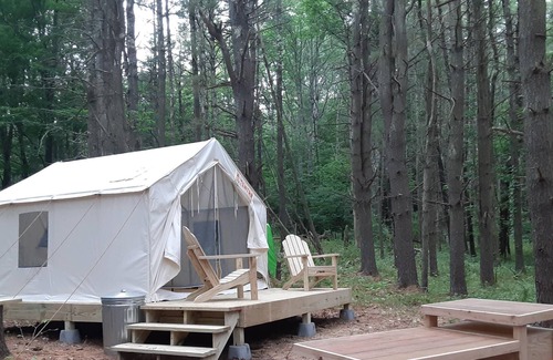 Each campsite includes a 10'x12' safari-style canvas tent on a raised platform, and you'll find one queen bed or a queen-size bunk bed inside (each site is different, see photos for the exact setup). Larger groups can also use the extra 5-person pop-up dome tent that’s provided (you’re welcome to bring your own camping gear too). You'll also have a 6-ft picnic table, outdoor fire pit, 2 Tentrr Adirondack chairs, and a heating source to keep you warm and toasty at night.