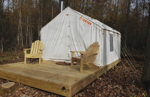 Each campsite includes a 10'x12' safari-style canvas tent on a raised platform, and you'll find one queen bed or a queen-size bunk bed inside (each site is different, see photos for the exact setup). Larger groups can also use the extra 5-person pop-up dome tent that’s provided (you’re welcome to bring your own camping gear too). You'll also have a 6-ft picnic table, outdoor fire pit, 2 Tentrr Adirondack chairs, and a heating source to keep you warm and toasty at night.