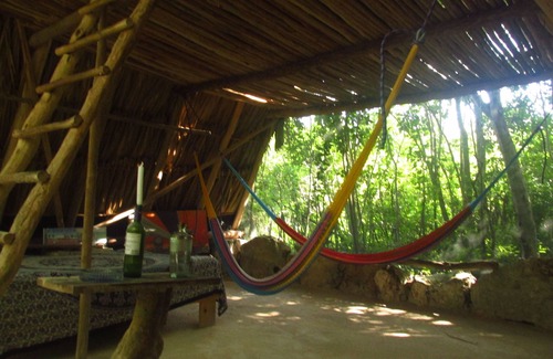 a redú of the traditional ha-tó shelter once commonly found at this lattidudes as mayan people would use as temporary jungle housing. Built from stone, wood and palms utilizing local craft and techniques with idea to provide the visitor a the experience of sleeping out towards the open nature. As the rest of the house and gardens, this bedroom is candle lit for an unsurpased ambient. This rather spaitious shelter can easily acommodate 5 people, perfect for independant groups looking up to enjoy some time on their own.