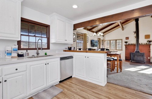 Step into The Bell Tower, where rustic charm meets modern comfort within a single-story upper-level lodge cottage retreat. Prepare to be captivated by breathtaking mountain and meadow views from the living room as you unwind and take in the joys of Big Bear together.