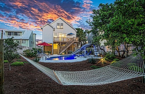 The house was chosen for its traditional beach cottage style. It has three bedrooms downstairs with a large living/dining/kitchen area as well as a large loft upstairs. The three bedrooms on the main level will be 1 King, 1 King and 1 Queen, the loft area has 4 Twins. The house has a total sleeping capacity of 10 people. In addition to the sleeping space upstairs there is a game nook with a foosball table, books and board games. Outside there is a large porch on the street side with both covered and open space. In the backyard there is a large pool with a slide and plenty of area to lounge, grill and enjoy time with friends and family. If you are a fisherman and would like to bring your boat to the island, South Shore is located 1 mile from the public boat ramp, and our driveway can easily accommodate up to a 30' boat/trailer. If you like to fish in the ocean, the boat ramp is roughly 8 miles via the ICWW from Topsail Inlet.