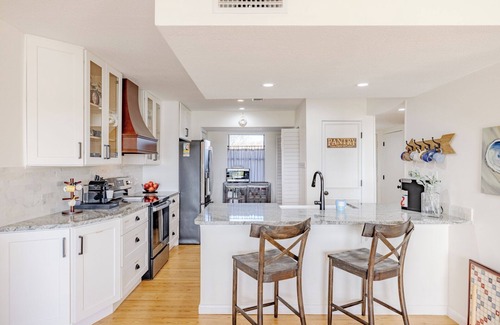 The Blue Pearl PCB sleeps up to 7 guests (6 all ages + 1 toddler). Inside is a gorgeous living area with oversized sectional sleeper sofa and two additional chairs. The three flatscreen smart TV's are large and perfect for taking in movies at night or sports on the weekend. The open concept kitchen offers all full-sized appliances, a beautiful farmhouse sink, and island that is perfect for prepping meals while socializing with friends and family. Dishes, pots, pans, silverware, blender, a Keurig Duo coffee maker, and more are available to make meal and snack prep a breeze. Seating for 4 is offered with our dining table with 2 bar stools situated at the kitchen peninsula counter. Pack n Play and/or a Graco Made-2-Grow Highchair/booster for infants-40 lb child are available upon request "before" check-in.