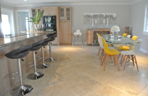 Our house is all on one level with an amazing chef’s / gourmet open kitchen with Jenn Air, GE appliances and an abundance of small appliances and kitchenware needed to prepare and serve gourmet meals. The kitchen is the center of the house, specially designed for entertaining delicious cooking with family and friends, which opens to dining and living rooms with comfortable sitting areas. The gourmet kitchen has a massive granite counter top island seating for up to 10 people (4 bar stools provided) and a formal wood dining table for 8.