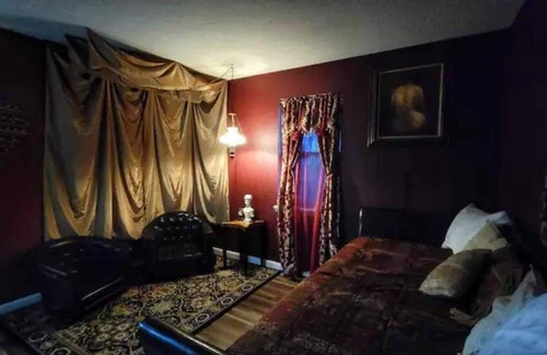 The yard is clear and fairly level offering a stone firepit and seasoned firewood. A propane grill can be found on a concrete pad for your use and is to the right of the covered RV or boat parking that brings you up the stairs to the side deck. There you'll find a 2-seater high top table where you'll find the side entrance from the deck to the living area. Out front a porch with seating welcomes you to a whimsical open area inside hosting the living room and dine in kitchen with a TV that can swivel to either space. Tucked next to the fridge you'll find the washer and dryer with detergent and dryer sheets. The hall bathroom has a shower with a bathtub and a double sink below great lighting. The master bedroom has lots of interesting and entertaining books to peruse during your stay either in bed by the lamplight or in the closet-turned-reading-nook and has a convenient half bath. One bedroom is cute, cozy, and comfy and offers a full bed for one or two guests with a wide open floor and a vintage vibe. Finally, the third bedroom is bold and brazen but offers a chill ambiance when only the hanging lamp is lit and you're chatting in the lowrider chairs, and has a detachable trundle for one or two guests.